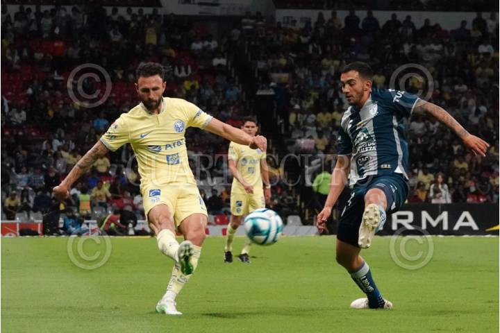 El jugador Miguel Layún, lateral del equipo del América, y Luis Chávez, mediocampista del equipo de Pachuca, disputaron el balón durante el Torneo Clausura 2023, Jornada 10 en el Estadio Azteca