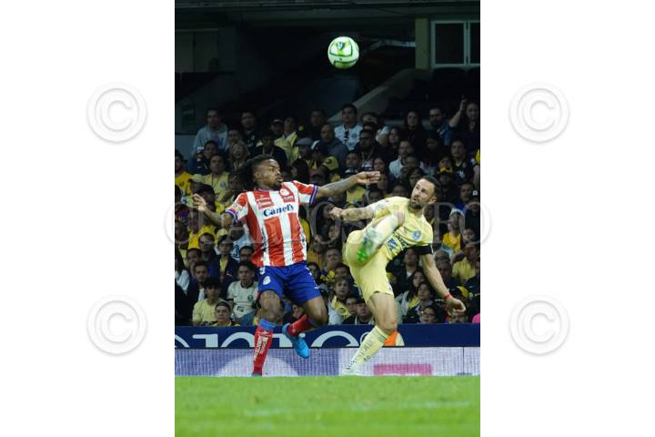 Jhon Murillo, extremo derecho del Atlético de San Luis, y Miguel Layún, lateral del América, disputaron el balón durante los cuartos de final de la Clausura 2023 en el Estadio Azteca