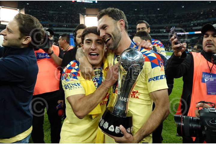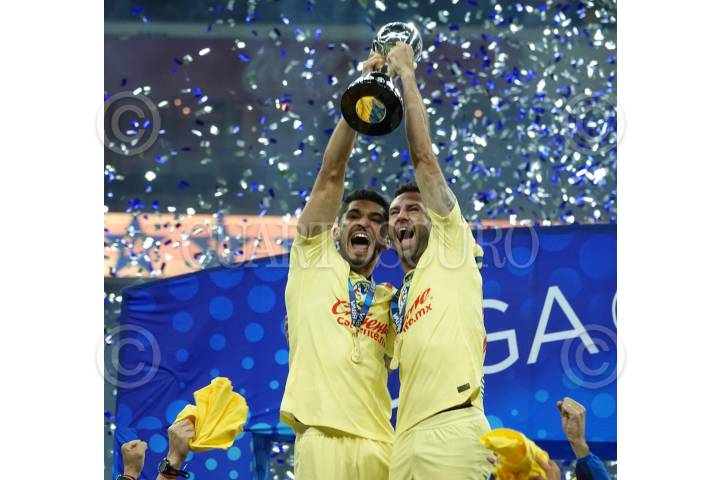 CIUDAD DE MÉXICO, 17DICIEMBRE2023.- Alejandro Zendejas, extremo derecho, y Miguel Layún, lateral, jugadores de las Águilas del América recibieron la Copa al ganar 3-0 contra los Tigres en la Final de Apertura 2023 en el Estadio Azteca. FOTO: GRACIELA LÓPEZ/CUARTOSCURO.COM