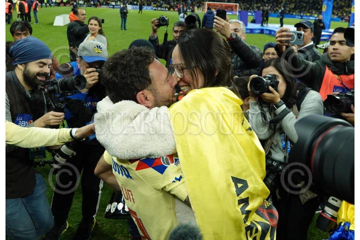 CIUDAD DE MÉXICO, 17DICIEMBRE2023.- El jugador Miguel Layún y su esposa Ana Laura Galván se besaron después de ser coronadas las Águilas del América recibieron la Copa al ganar 3-0 contra los Tigres en la Final de Apertura 2023 en el Estadio Azteca. FOTO: GRACIELA LÓPEZ/CUARTOSCURO.COM