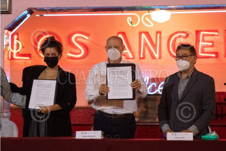 Renee Mooi, Carlos Mackinlay y Miguel Nieto, encabezaron la firma de colaboración para impulsar el turismo musical en la capital, el encuentro se realizó en el Salón Los Ángeles.