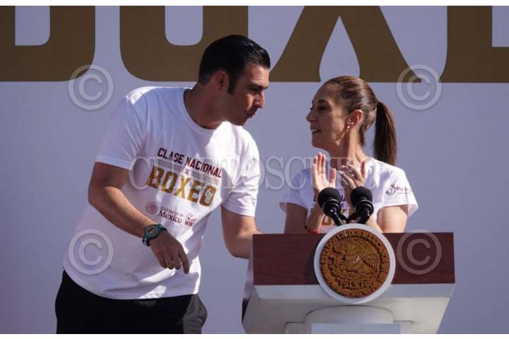 CIUDAD DE MÉXICO, 06ABRIL2025.- Miguel Torruco, director Nacional de promotor al Deporte, y Claudia Sheinbaum, presidenta constitucional de los Estados Unidos Mexicanos, conversaron durante la Clase Masiva de Boxeo realizada en el Zócalo capitalino. FOTO: GRACIELA LÓPEZ/CUARTOSCURO.COM