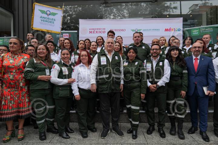 CIUDAD DE MÉXICO, 24JUNIO2024.- Judith Guerra, presidenta del Grupo Mexicano de Asociaciones de Agencias de Viaje y Empresas Turísticas (GMA); Miguel Torruco, Secretario de Turismo, y Octavio de la Torre de Stéfano, Presidente de la Confederación de Cámaras Empresariales (CONCANACO SERVYTUR), posaron con personal de la Unidad de Ángeles Verdes. Esta mañana se presentaron nuevas patrullas que brindaran servicios a turistas en las carreteras de México. FOTO: ALICE MORITZ/CUARTOSCURO.COM