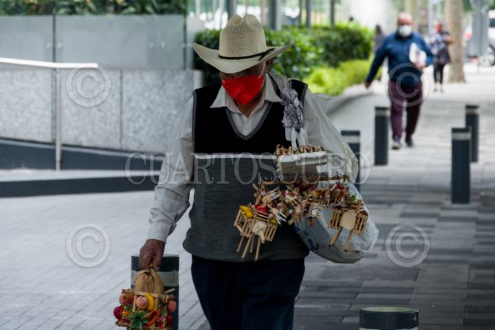 Don José (90) camina, en busca de clientes, con sus mulitas de hojas de maíz en este jueves de Corpus Christi, sobre Avenida Insurgentes Sur.