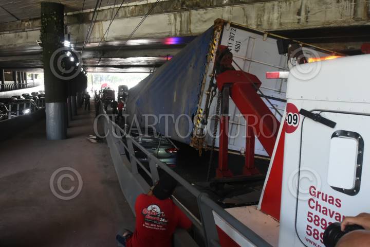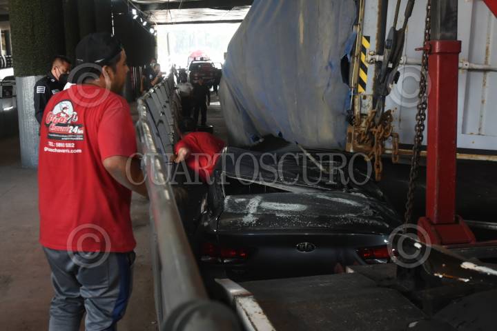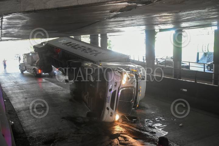 Una mujer que viajaba en su auto salvo la vida luego de que le cayera la caja de un tráiler que volcó en el bajopuente de Circuito del Parque y Periférico, en Satélite.