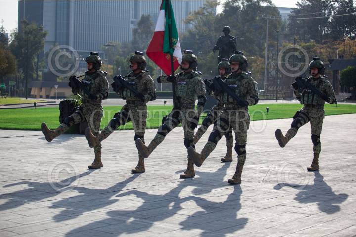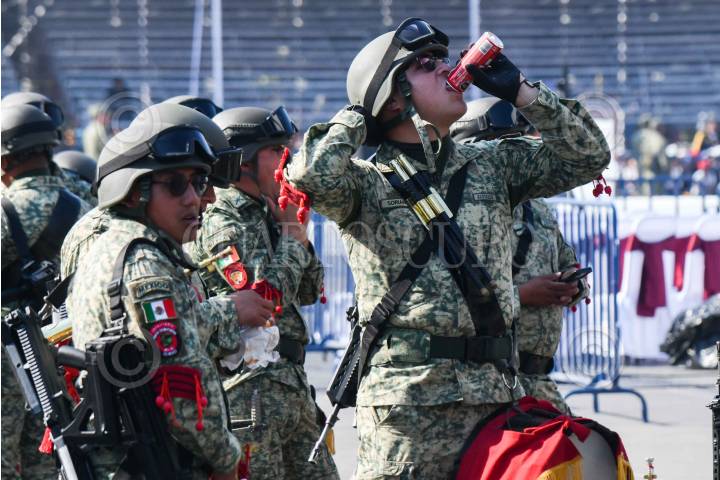 CIUDAD DE MÉXICO, 28FEBRERO2025.- Un militar se refresca con un refresco durante el ensayo del evento protocolario por los 500 años del asesinato del tlatoani de Tenochtitlán, Cuauhtémoc, el cual se realizará mañana en la plancha del zócalo capitalino encabezado por Claudia Sheinbaum, presidenta de México. FOTO: MARIO JASSO/CUARTOSCURO.COM