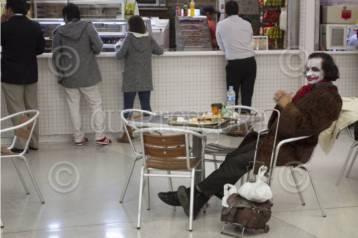 MÉXICO, D.F., 07ENERO2014.- Un mimo que realiza su espectáculo en plazas publicas, se toma un descanso en un restaurante de comida rápida. FOTO: GUILLERMO PEREA /CUARTOSCURO.COM