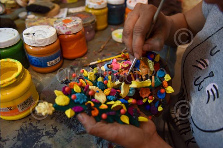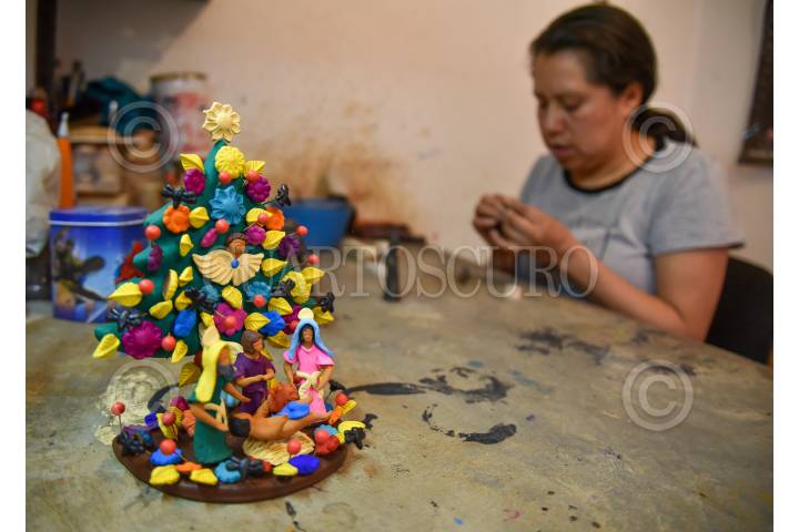 Nacimientos miniatura de barro elaborados por la artesana Reyna Martínez, tercera generación dedica a elaborar piezas miniatura.