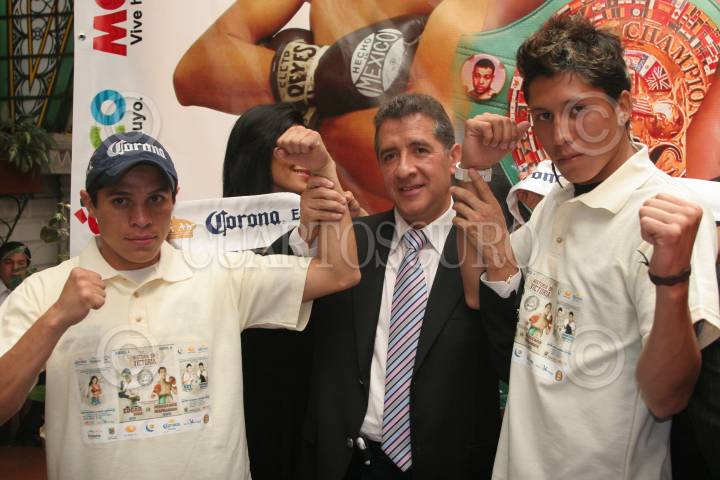MÉXICO, D.F., 11FEBRERO2009.- Edgar Sosa campeón mundial minimosca y Reyes Sanchez campeón Continental de las Américas, durante la presentación de la función boxistica ¡HISTORIA EN VICTORIA! que se realizara en Ciudad Victoria, Tamaulipas el 4 de abril en el Centro de Espectáculos Recinto Ferial de Ciudad Victoria. FOTO: RICARDO CASTELAN/CUARTOSCURO.COM