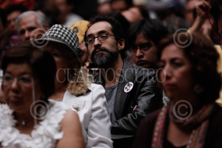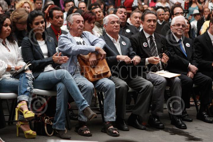 MEXICO,D.F., 06JUNIO2011.- Lydia Cacho, periodista; Rius, monero; Ricardo Rocha, periodista; y Genaro Góngora Pimentel, ex ministro de la Suprema Corte de Justicia de la Nación; participaron en el acto " 1 minuto X no + Sangre" donde intelectuales, artistas, caricaturistas, músicos, víctimas y sociedad civil, expresaron su punto de vista sobre la violencia e inseguridad que se vive actualmente en México. FOTO: IVAN STEPHENS/CUARTOSCURO.COM