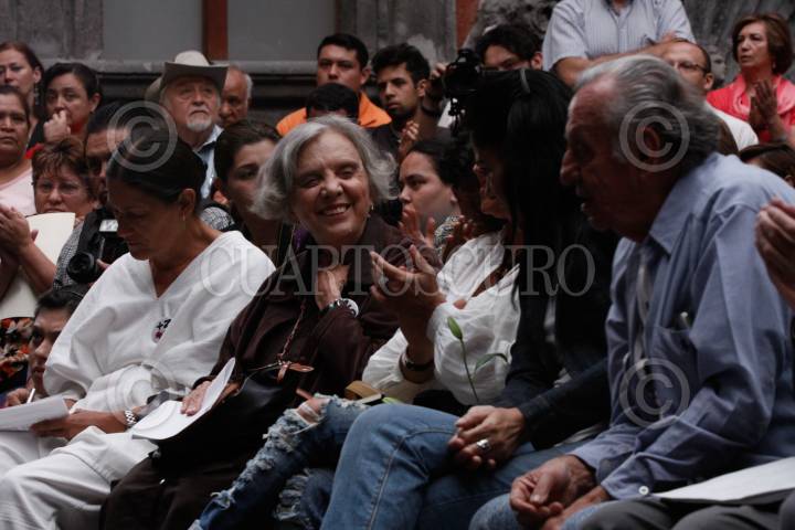 MEXICO,D.F., 06JUNIO2011.- Jesusa Rodríguez, Elena Poniatowska, escritora; Lydia Cacho, periodista; y Rius, monero; participaron en el acto " 1 minuto X no + Sangre" donde intelectuales, artistas, caricaturistas, músicos, víctimas y sociedad civil, expresaron su punto de vista sobre la violencia e inseguridad que se vive actualmente en México. FOTO: IVAN STEPHENS/CUARTOSCURO.COM