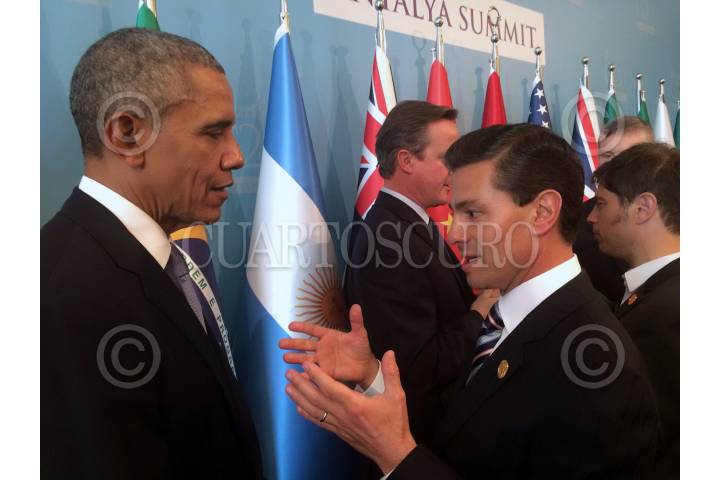 ANTALYA, REPÚBLICA DE TURQUIA, 15NOVIEMBRE2015.- Durante el primer día de trabajos de la Cumbre de Líderes del G20 que se desarrolla en esta ciudad, el Presidente Enrique Peña Nieto conversó con el Presidente de los Estados Unidos de América, Barack Obama. FOTO: PRESIDENCIA /CUARTOSCURO.COM
