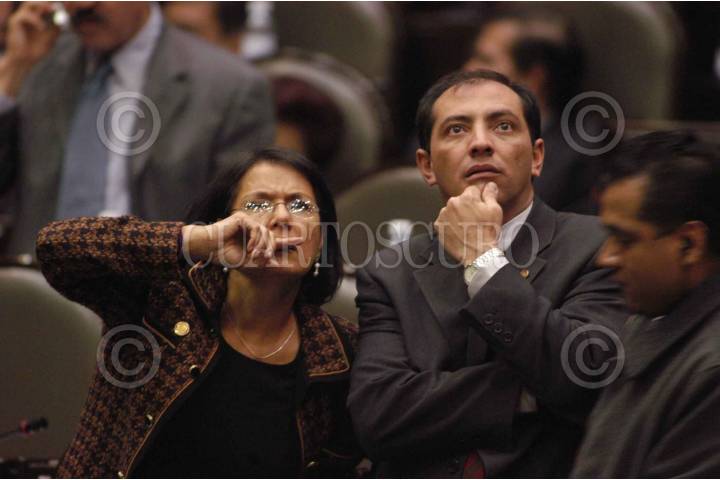México D.F22DICIEMBRE2003.- Los diputados María Esther Sherman (PRl) escucha atenta al panista Gustavo Madero, presidente de la comisión de hacienda y presupuesto de la cámara, dentro de la sesión del recinto de San Lázaro. FOTO: Germán Romero/CAURTOSCURO.COM