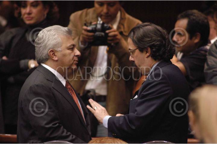 México D.F22DIC2003.- Los diputados Emilio Chuayffet (PRI) y Juan Molinar Horcasitas (PAN) platican en la sesión de la la Cámara de Diputados, dentro de la sesión del recinto de San Lázaro. FOTO: Germán Romero/CAURTOSCURO.COM