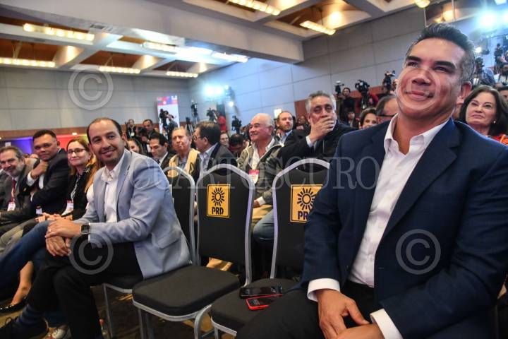 Los dirigentes nacionales: Marko Cortés (PAN) y Alejandro Moreno (PRI) junto a las sillas vacías de la representación del PRD, en el primer foro "Diálogos Ciudadanos" del Frente Amplio por México.