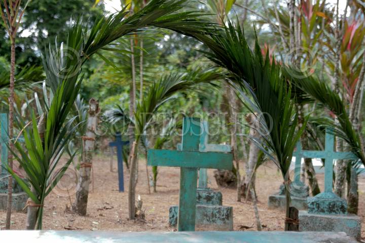 TACOTALPA, TABASCO, 31OCTUBRE2010.- Indígenas Zoques y Chol en el poblado Puxcatán tienen una manera especial al decorar las tumbas de sus seres queridos ya extintos en el campo santo, donde utilizan un tipo de rama de palma previamente bendecidas por el párroco de la localidad, así mismo les dejan frutos de la región. FOTO: MARCO POLO GUZMÁN HERNÁNDEZ/CUARTOSCURO.COM