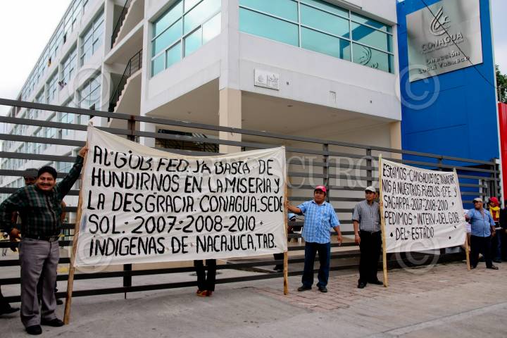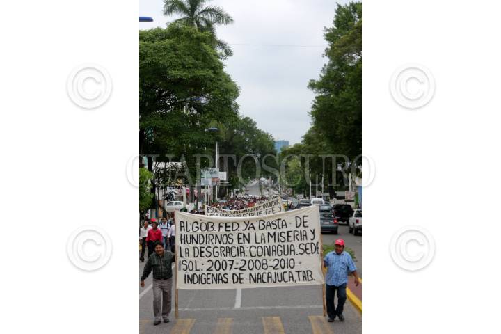 VILLAHERMOSA, TABASCO, 08NOVIEMBRE2010.- Alrededor de 400 habitantes de Huatacalca, Belen, Oxiacaque, Chiflón, El Sitio, Isla Guadalupe, Pastal y Chicozapote (comunidad chontal con dialecto zoque) marchan por el Paseo Tabasco en protesta por la falta de ayuda, ya que a tres meses aun permanecen inundados. Así mismo tomaron las instalaciones de la CONAGUA y mantienen cerrado al flujo vehicular el Paseo Tabasco esquina avenida 27 de Febrero en donde amenazan con permanecer tres día si es que no les resuelven sus demandas. FOTO: MARCO POLO GUZMÁN HERNÁNDEZ/CUARTOSCURO.COM