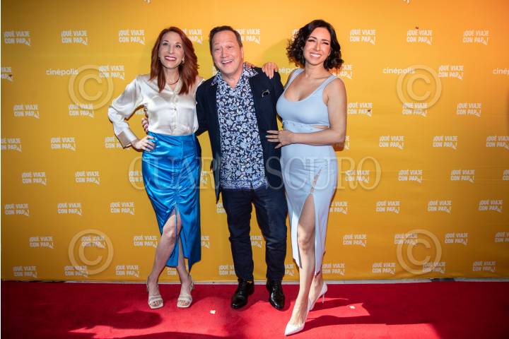 Mónica Huarte, Rob Schneider y Patricia Azarcoya a su paso por la alfombra roja para presentar la película ¡Qué viaje con papá! en la Ciudad de México.
