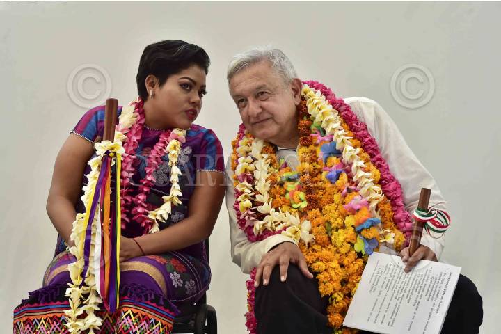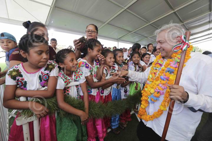 TLAPA DE COMONFORT, GUERRERO, 24NOVIEMBRE2019.- Andrés Manuel López Obrador, Presidente de México, encabezó el "Diálogo con los Pueblos Tlapaneco, Mixteco, Amuzgo y Náhuatl", ahí convivió con pobladores de estas comunidades, quienes le brindaron varios presentes, en su discurso señalo que la desaparición de los 43 estudiantes de Ayotzinapa no era un crimen de estado. FOTO: PRESIDENCIA /CUARTOSCURO.COM