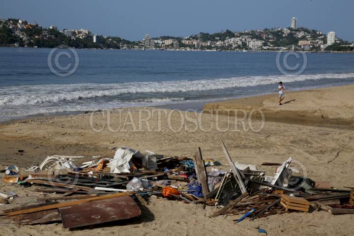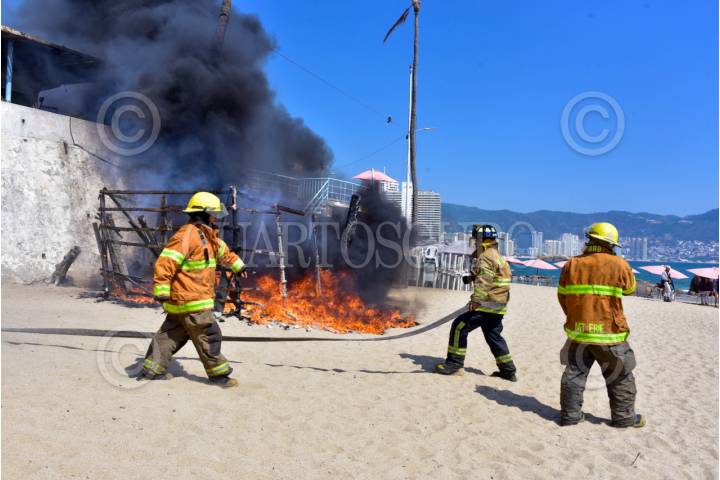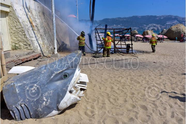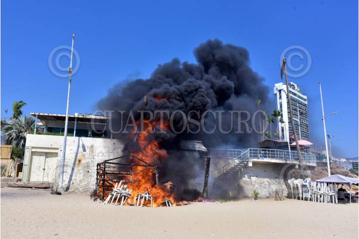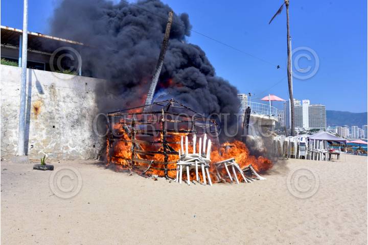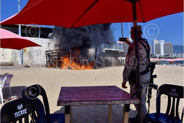 ACAPULCO, GUERRERO, 13MARZO2024.- Mobiliario de playa se incendio esta tarde en la playa El Morro, sillas, mesas, sombrillas y toldos fueron consumidos por el fuego, mientras la Guardia Nacional resguardo mientras ocurria el siniestro, que fue sofocado por bomberos, en los últimos días mobiliario y motos acuáticas, se han incendiado en diferentes playas de Acapulco, sin que la autoridad explique cuales son las causas de los incendios. FOTO: CARLOS ALBERTO CARBAJAL/CUARTOSCURO.COM
