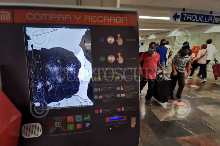 Máquina dañada de compra y recarga de tarjetas del metro, en la estación Zócalo.