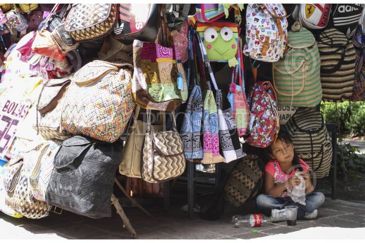 MÉXICO, D.F., 10OCTUBRE2015.- Decenas de bolsas y mochilas cuelgan en uno de los puestos de los locatarios del Bosque de Chapultepec. Abajo, una niña disfruta de un refresco para aminorar el intenso calor. FOTO: MARÍA JOSÉ MARTÍNEZ /CUARTOSCURO.COM