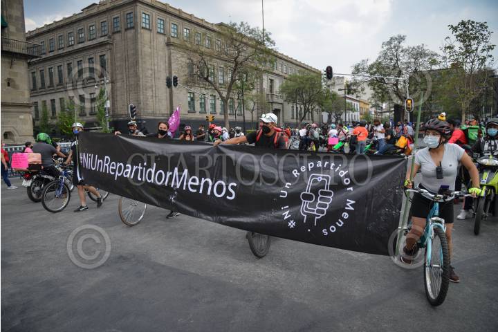 Integrantes de la organización "#NiUnRepartidorMenos" se manifestaron al exterior de Palacio Nacional para exigir a las autoridades se respeten sus derechos laborales.