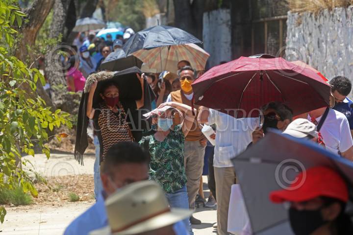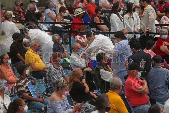 Personas de edad adulta hacen fila para que servidores de la nación revisen la documentación y posteriormente ser vacunados contra el Covid-19.