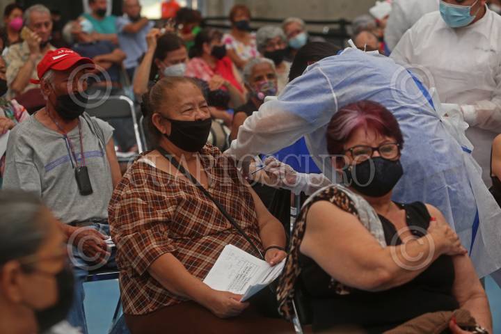 Personas de edad adulta son vacunados contra el Covid-19 en el Gimnasio de usos múltiples del CUCEI.