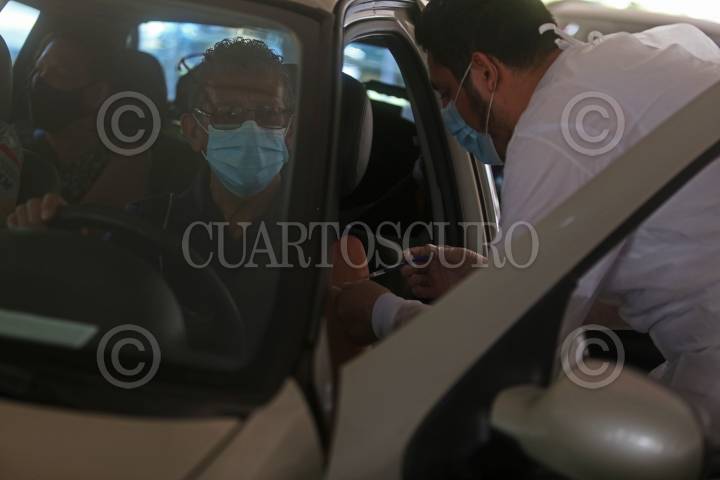 Una persona encargada de la inmunización contra el Covid-19, aplica el biológico de Pfizer a personas de la tercera edad que acuden al Drive Thru del modulo ubicado en las instalaciones del Centro Centro Universitario de Ciencias Exactas e Ingenierías (CUCEI), de la Universidad de Guadalajara (U.de G.).