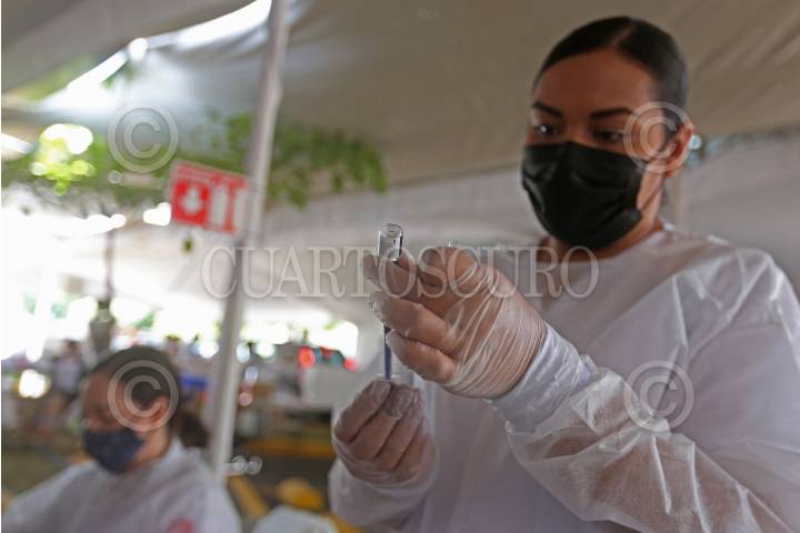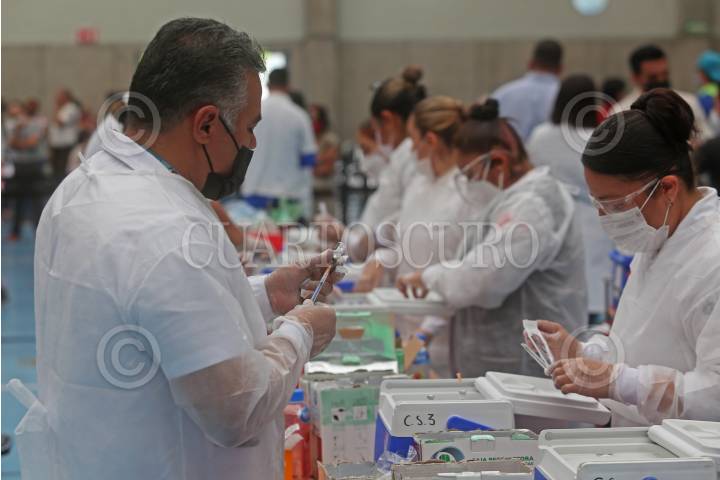 Personal encargado de la inmunización, preparan las dosis de la vacuna contra Covid-19 para posteriormente ser aplicadas a personas de la tercera edad.