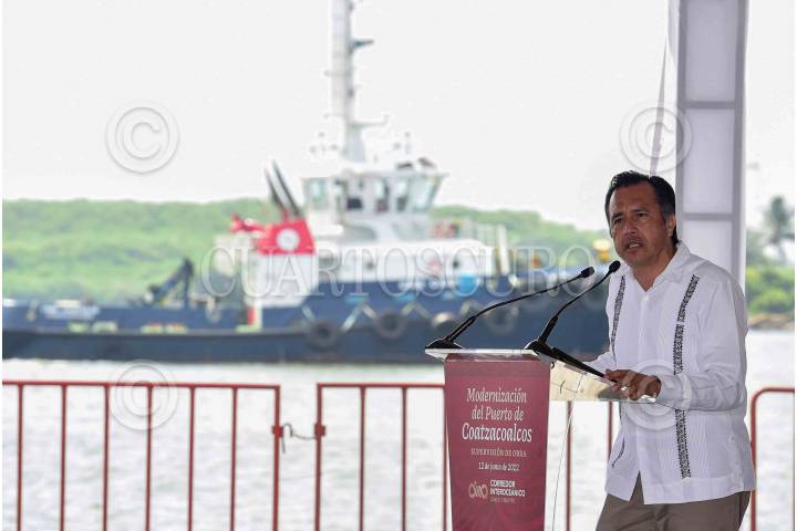 Cuitláhuac García, gobernador de Veracruz, en el evento de supervisión de obra de la Modernización del Puerto de Coatzacoalcos.