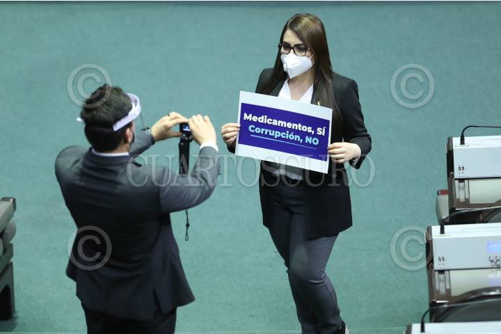 Una diputada muestra un cartel con la leyenda "Medicamento, Sí, Corrupción, NO".