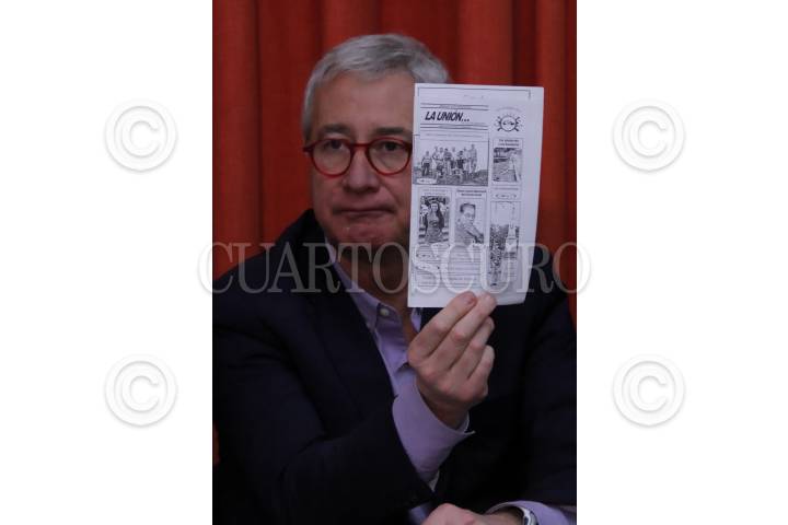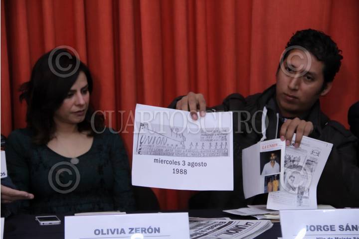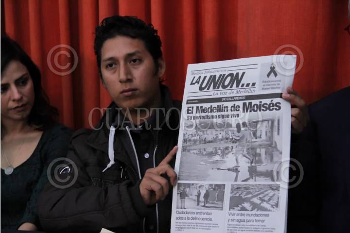 MÉXICO, D.F., 12FEBRERO2015.- Rodrigo Soberanes, periodista veracruzano, Olivia Zerón, periodista, Jorge Sánchez, hijo de Moisés Sánchez, Javier Solórzano, periodista y Darío Ramírez, director de Artículo 19 México, durante la presentación de un periódico "La Unión... La voz de Medellín" edición especial en memoria de Moisés Sánchez, periodista asesinado en el estado. FOTO: ADOLFO VLADIMIR /CUARTOSCURO.COM
