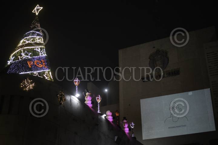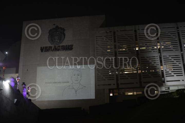 Jorge Sánchez, hijo del periodista asesinado Moisés Sánchez, proyecto imágenes de los periodistas asesinados en Veracruz en la fachada de la fiscalía veracruzana para exigir avances en las investigaciones de estos crímenes.
