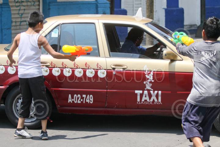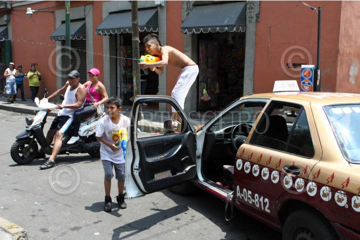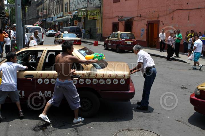 MÉXICO, D.F., 23ABRIL2011.- Un grupo de niños y jóvenes en la calle de Colombia en el Centro Histórico, mojaron a un taxista que circulaba por el lugar en este Sábado de Gloria en donde pasaron por alto la recomendaciones de abstenerse de desperdiciar el vital liquido. FOTO: RODOLFO ANGULO/CUARTOSCURO.COM