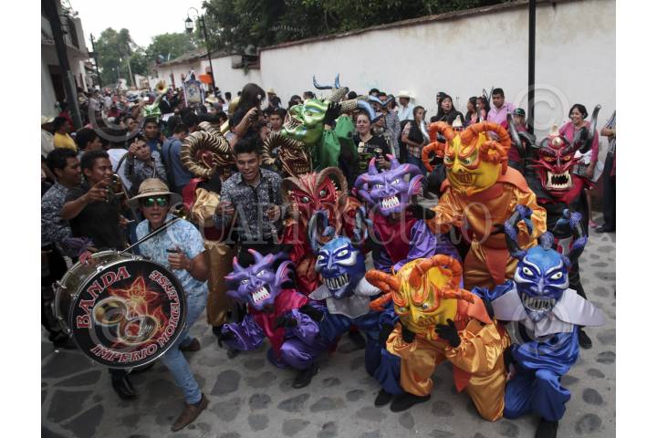 ZACUALPAN DE AMILPAS, MORELOS, 25SEPTIEMBRE2016.- Con la procesión de la Mojiganga por las calles iniciaron las celebraciones de la fiesta anual en honor de la Virgen del Rosario. La Mojiganga es una comparsa de hombres mujeres que eligen un tema para representar y participar recorriendo el pueblo con una banda de viento que no cesa de tocar. Este año se celebró la edición numero 51. FOTO: MARGARITO PÉREZ RETANA /CUARTOSCURO.COM