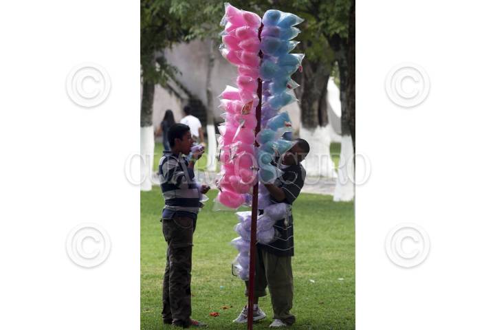 ZACUALPAN DE AMILPAS, MORELOS, 25SEPTIEMBRE2016.- Con la procesión de la Mojiganga por las calles iniciaron las celebraciones de la fiesta anual en honor de la Virgen del Rosario. La Mojiganga es una comparsa de hombres mujeres que eligen un tema para representar y participar recorriendo el pueblo con una banda de viento que no cesa de tocar. Este año se celebró la edición numero 51. En la imagen un niño compra los tradicionales algodones de azúcar. FOTO: MARGARITO PÉREZ RETANA /CUARTOSCURO.COM
