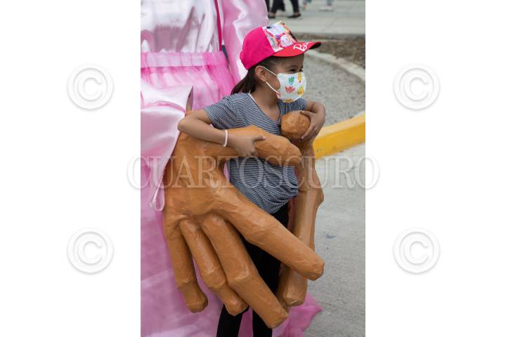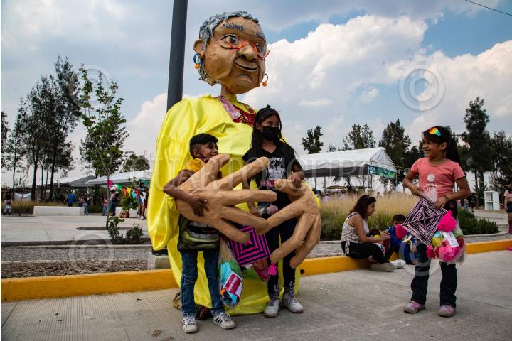 Niña entre las manos de una mojiganga durante el "Festival de l@s niñ@s" en el parque Cuitláhuac de la Alcaldía Iztapalapa.