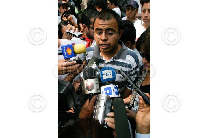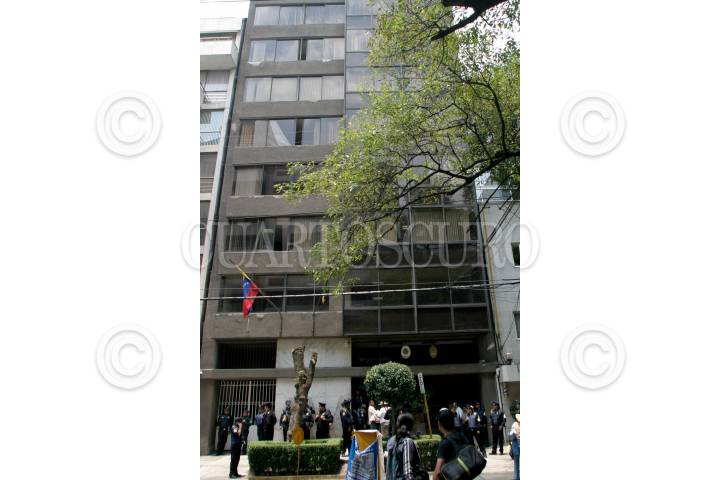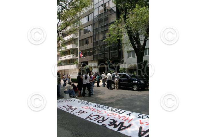 MÉXICO, D.F., 23JUNIO2010.- El hermano de América del Valle y también integrante del movimiento Frente de Pueblos en Defensa de la Tierra (FPDT) de San Salvador Atenco, en compañía de varios integrantes de dicho movimiento, se apostaron frente a la Embajada de Venezuela donde se encuentra América para pedir asilo político ya que en el país cuenta con varias ordenes de aprehensión motivo que la a obligado a ser prófuga de la justicia. FOTO: ENRIQUE ORDÓÑEZ/CUARTOSCURO.COM