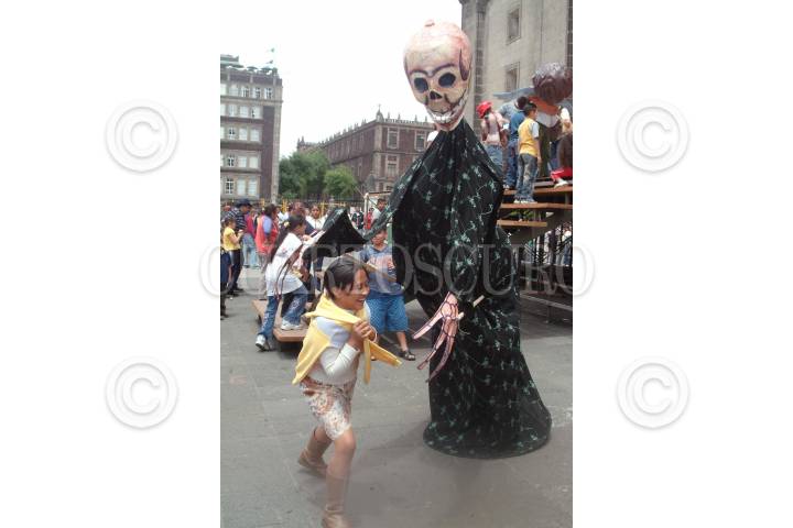 MÉXICO, D. F. 09ABRIL2004.- Un monigote con forma de calavera juega con una niña en el atrio de la catedral metropolitana. FOTO: Iván Stephens/CUARTOSCURO.COM