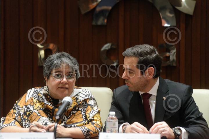 Jose Abugaber, presidente de la Confederación de Cámaras Industriales (Concamin) y Raquel Buenrostro, secretaria de Economía, durante la inauguración del Centro de Inteligencia Concamin.