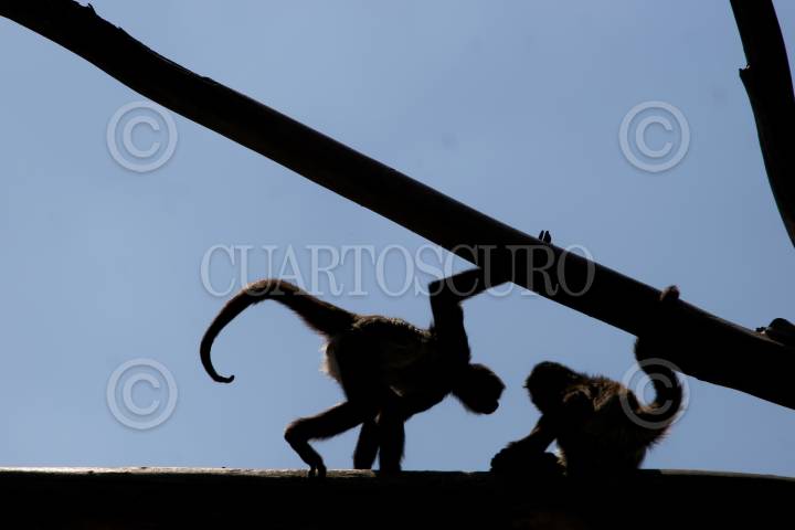 MÉXICO, D.F., 25ENERO2009.- Dos monos araña juegan en unos troncos esto en el zoológico de San Juan de Aragon FOTO: RICARDO CASTELAN/CUARTOSCURO.COM