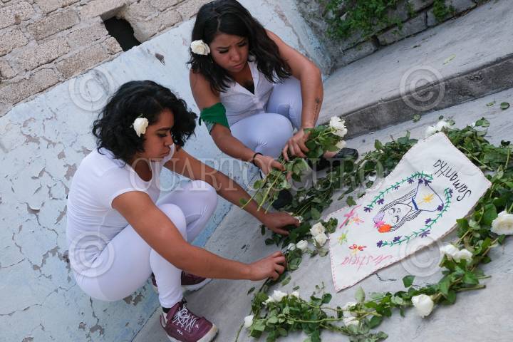 ECATEPEC, ESTADO DE MÉXICO, 06OCTUBRE2019.- Familiares de víctimas de feminicidios en este municipio y el colectivo "Mujeres de la periferia para la periferia" realizaron la protesta "Caravana contra los feminicidios en Ecatepec, para que no nos asesinen por ser mujeres". Se realizó un recorrido por cuatro lugares diferentes, como forma de acto de memoria y visibilización en exigencia de Justicia. En el primer punto se colocaron flores en memoria de Samantha, una niña de 2 años, quien fue asesinada en la calle Claveles, colonia Vista Hermosa. En el segundo punto se realizó un performance en memoria de Angélica y Karla, quiénes fueron asesinadas después de un baile, en la colonia Jardines de Morelos. El tercer punto lo encabezó la "Organización de trabajadoras de México", en la que colocaron flores y prendieron veladoras en el altar dedicado a las diferentes víctimas del Monstruo de Ecatepec. Y por último, se realizó un performance como forma de protesta frente al Palacio de Gobierno, para exigir a las autoridades Verdad y Justicia, así como más seguridad para todas las niñas y mujeres de la localidad. FOTO: GRACIELA LÓPEZ /CUARTOSCURO.COM