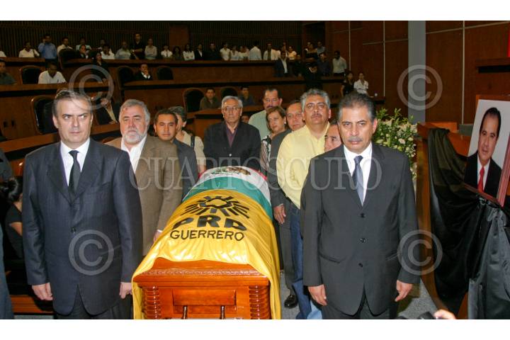 CHILPANCINGO, GUERRERO, 21AGOSTO2009.- Marcelo Ebrard, jefe de gobierno del D.F., Alejandro Encinas; Guadalupe Acosta Naranjo y Jesús Ortega, presidente nacional del PRD durante la sesión solmene en donde montaron una guardia de honor ante el feretro del diputado perredista Armando Chavarría, asesinado ayer en este estado. FOTO: CUARTOSCURO.COM