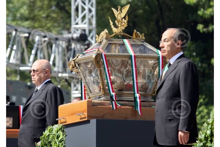MÉXICO, D.F., 30MAYO2010.- El presidente Felipe Calderón acompañado de Guillermo Ortiz Mayagoitia, ministro presidente de la Suprema Corte de Justicia montaron una guardia de honor frente a los restos de Miguel Hidalgo, Ignacio Allende, Juan Aldama, José María Morelos, Mariano Matamoros, Mariano Jiménez, Javier Mina, Vicente Guerrero, Leona Vicario, Andrés Quintana Roo, Nicolás Bravo y Guadalupe Victoria cuyos restos fueron exhumados de la columna del Ángel de la Independencia durante un homenaje a los restos de los Héroes de la Patria. FOTO: RODOLFO ANGULO/CUARTOSCURO.COM