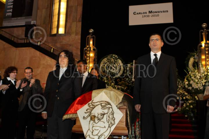 MÉXICO, D.F., 20JUNIO2010.- Conzuelo Saizar, titular de Conaculta y Alonso Lujambio, titular de la SEP montaron una guardia de honor durante el homenaje de cuerpo presente al escritor y ensayista mexicano Carlos Monsiváis en el Palacio de Bellas Artes en donde amigos, colegas, familiares y público en general asistieron para darle el último adios al escritor después de haber fallecido el día de ayer por problemas respiratorios. FOTO: RODOLFO ANGULO/CUARTOSCURO.COM