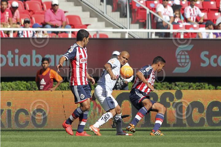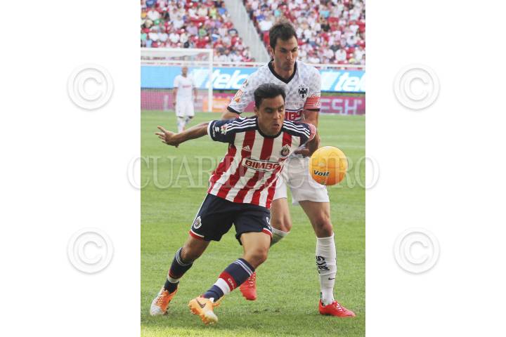 ZAPOPAN, JALISCO, 27ABRIL2014.- Omar Bravo, disputa un balón frente a José María Basanta durante le partido de las Chivas de Guadalajara y los Rayados de Monterrey como parte de la jornada 17 del torneo Clausura 2014 de la Liga MX. FOTO: FERNANDO CARRANZA GARCIA /CUARTOSCURO.COM