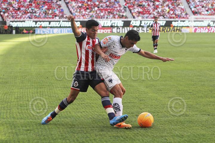 ZAPOPAN, JALISCO, 27ABRIL2014.- Jesús Sánchez, disputa un balón frente a Ricardo Osorio durante le partido de las Chivas de Guadalajara y los Rayados de Monterrey como parte de la jornada 17 del torneo Clausura 2014 de la Liga MX. FOTO: FERNANDO CARRANZA GARCIA /CUARTOSCURO.COM