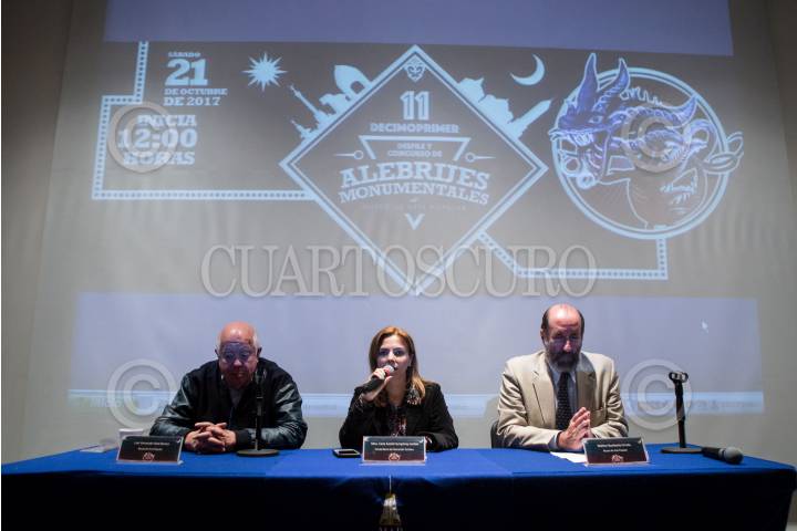 CIUDAD DE MÉXICO, 17OCTUBRE2017.- Luis Haza, Walther Boelsterly, del Museo de Arte Popular, y Carla Humphrey, del Fondo Mixto de Promoción Turíscitca, encabezaron la conferencia de prensa sobre la Décima Primera edución del Desfile y Concurso de Alebrijes Monumentales, que se se llevará a cabo el sábado 21 de octubre a partir de las 12:00 horas del Zócalo capitalino al Ángel de la Independencia. Asimismo, los alebrijes quedarán sobre Paseo de la Reforma hasta el domingo 5 de noviembre. FOTO: TERCERO DÍAZ /CUARTOSCURO.COM